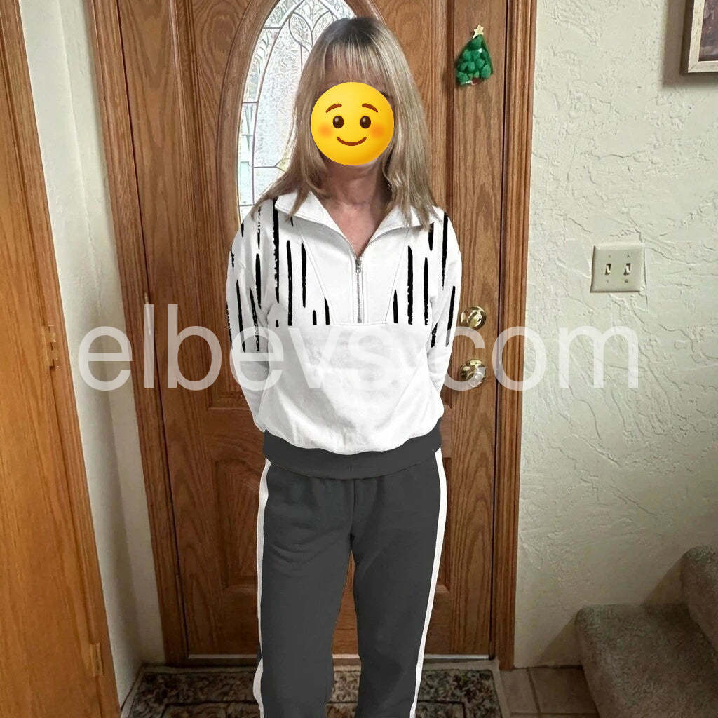 The two-piece set looks effortlessly chic and incredibly comfortable. The white zip-up top with the bold black stripe print pairs perfectly with the dark gray joggers, making it ideal for a casual day out or a relaxed photoshoot. I especially love the roomy pockets and the comfy cuffs. Highly recommend!