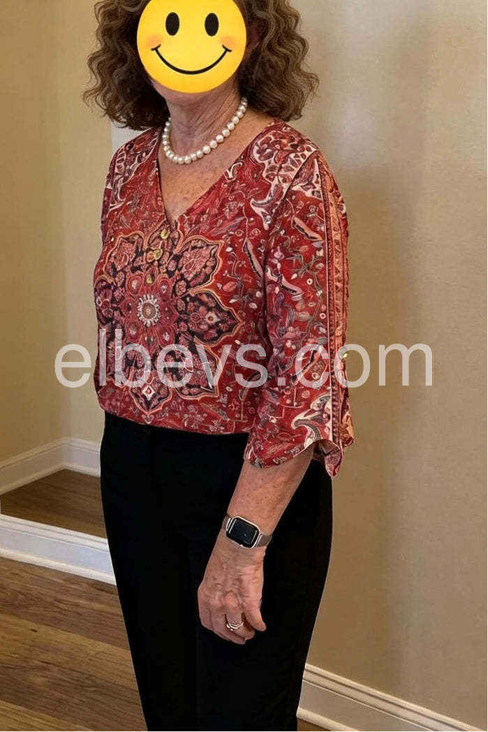 Absolutely love the bohemian print on this top! The colors are just as vibrant as the picture. The v-neck is flattering without being too deep, and it pairs perfectly with white linen pants for a summer evening.