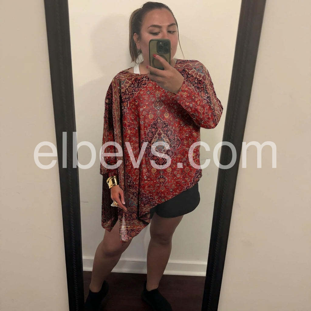 If you are looking for a top that is forgiving and stylish, this is it. The asymmetrical cut creates a lovely silhouette that elongates the body. The vintage rug pattern is gorgeous in person. Very happy with my purchase.